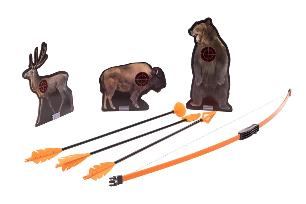 Become an Adventurer with this bow and arrow set. This set includes a 34″ bow, three knock down targets, and three arrows with a variety of arrow heads. Each Arrow head is made of soft plastic making for a safe play experience! Recommended for target shooting only.