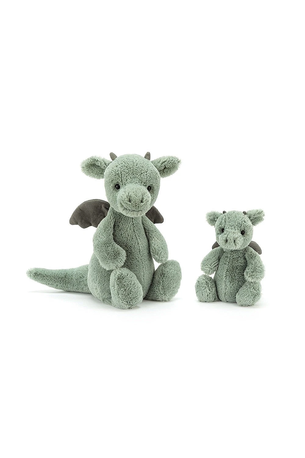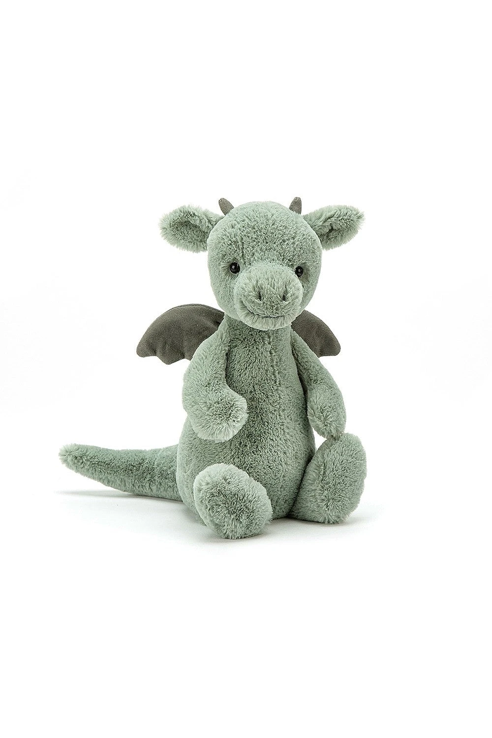 With super soft fur in pale sage green, suedey horns and a long, squidgy tail, this brilliant beastie is pretty fantastic. We love those neat little contrast wings, chunky feet and fine flappy ears – what a legend!