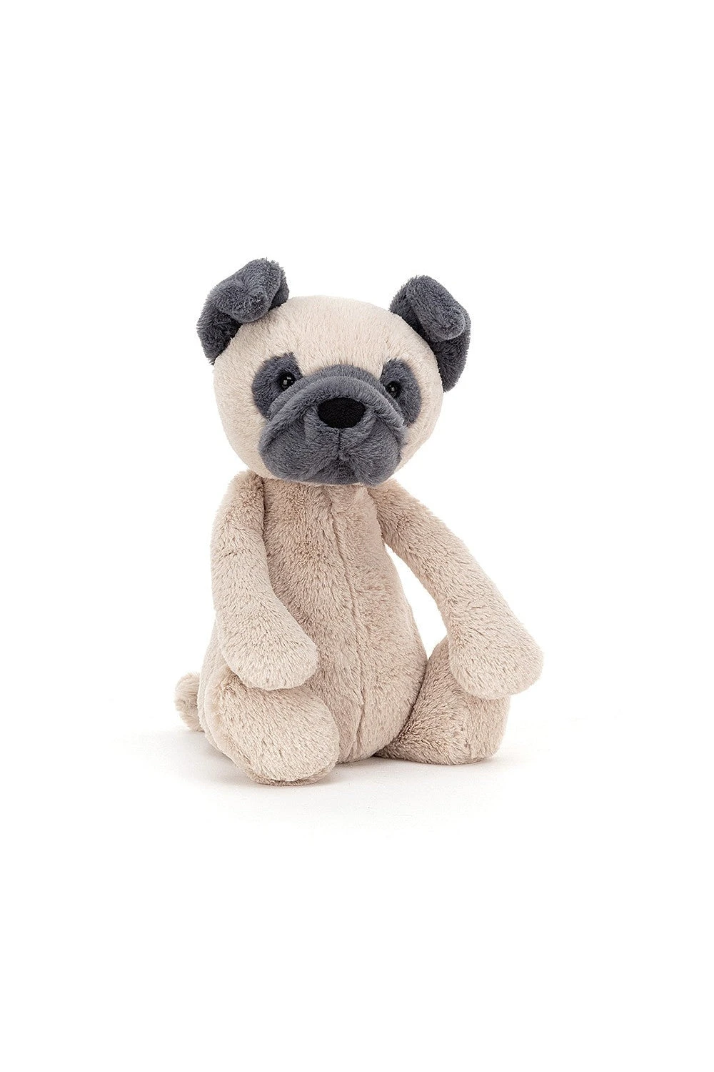 Gentle and affable, Bashful Pug is a tumbly, rumply rascal. Beautifully soft with a plump, beigey tum and a pebble-grey wrinkly muzzle, this curious pup has sweet foldy ears and a very boopable nose.
