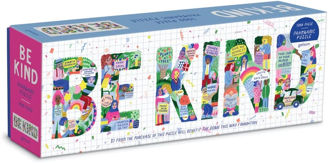 A fun challenge, the Be Kind 1000-piece panoramic puzzle from Galison features a wide landscape image that focuses on a very important message of being kind. The finished puzzle measures 39” x 14”. This landscape puzzle features an intricate design that will entertain and delight any puzzler. This inspirational jigsaw puzzle includes a 21 Day of Kindness Full-In Calendar that you can fill in with your own kindness prompts.