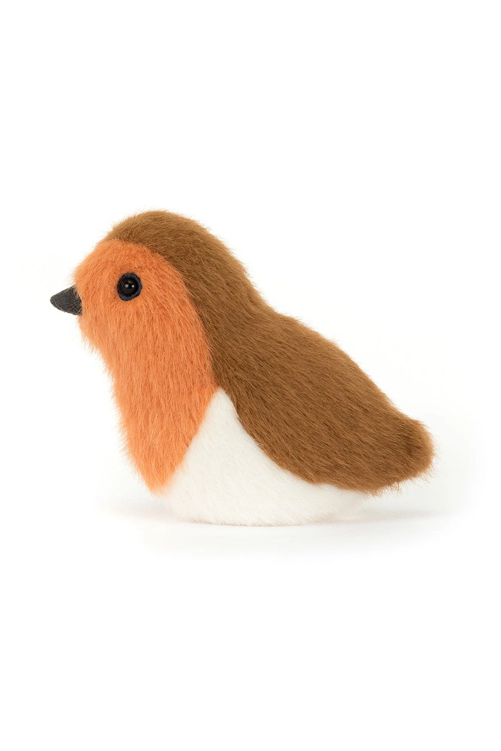 Birdling Robin is bright, bold and breezy, with beautiful block-color fur! This perky pip has a cocoa tail, vanilla tummy and rust-red bib. With a suedey pebble beak and shiny eyes, this robin’s a charismatic scamp. Perch this robin on your desk for plenty of pep!