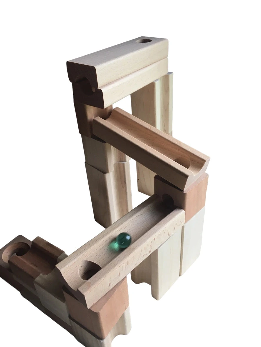 Block and Marble run features 41 blocks made of North American hardwoods and ten marbles. It is built to last for generations and is made for free play!