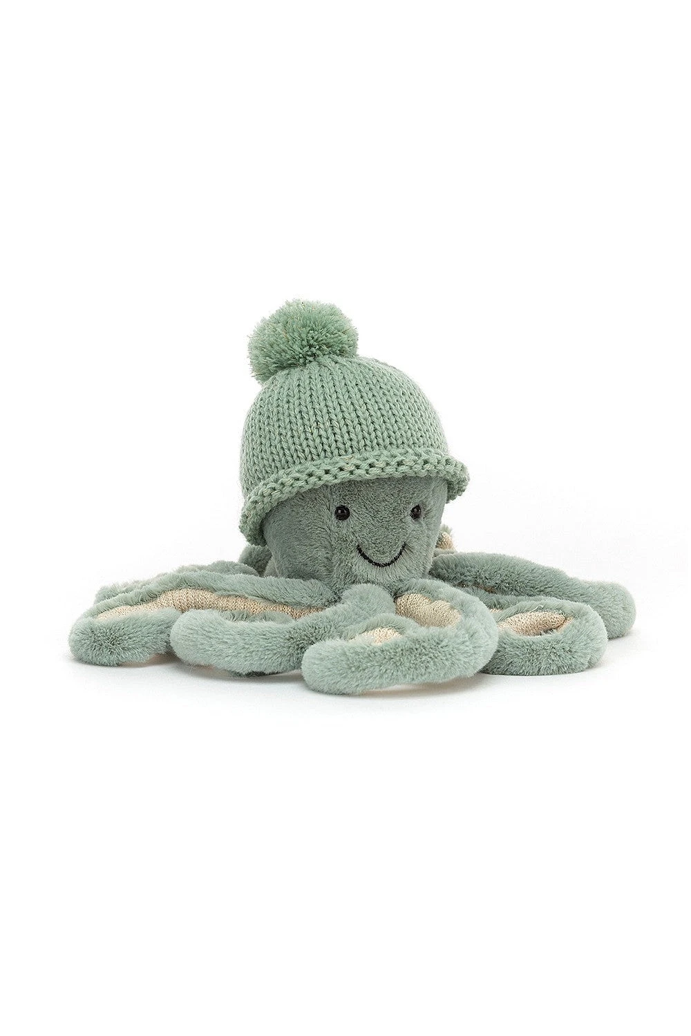 There’s nothing like a minty knit hat for keeping your mantle mighty toasty! Cozi Odyssey Octopus never leaves the seabed without one! Springy and zingy, with oodles of arms in gentle green fur and creamy cord, this miniature matey is squiggly-snuggly!
