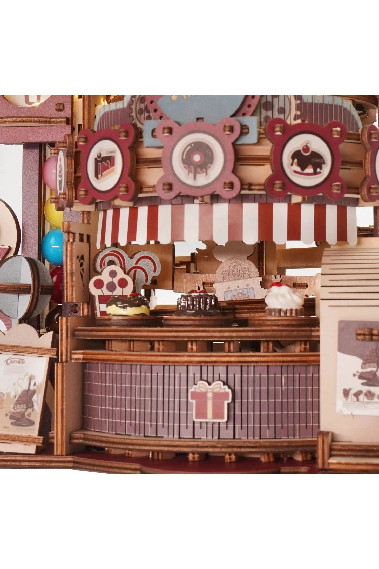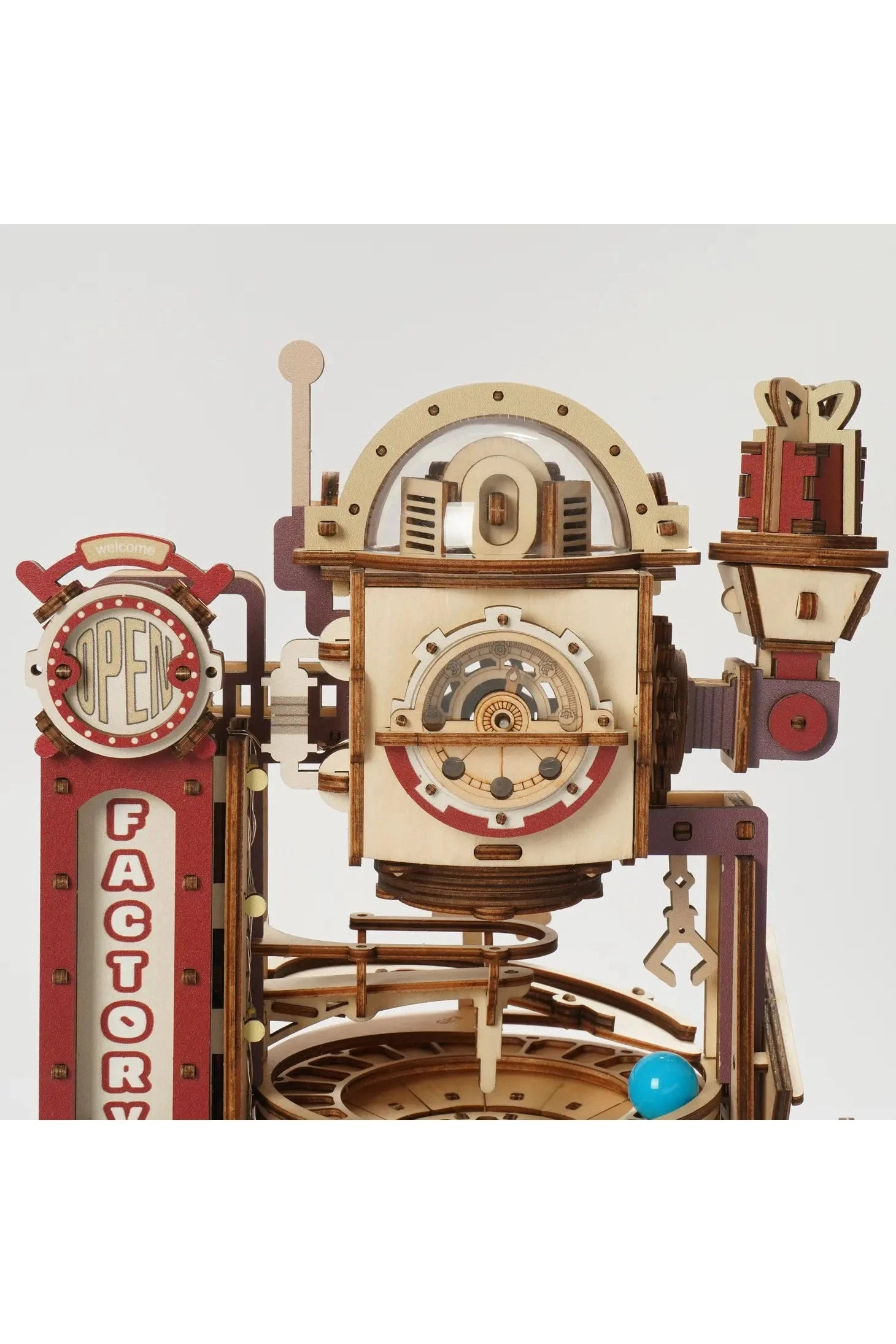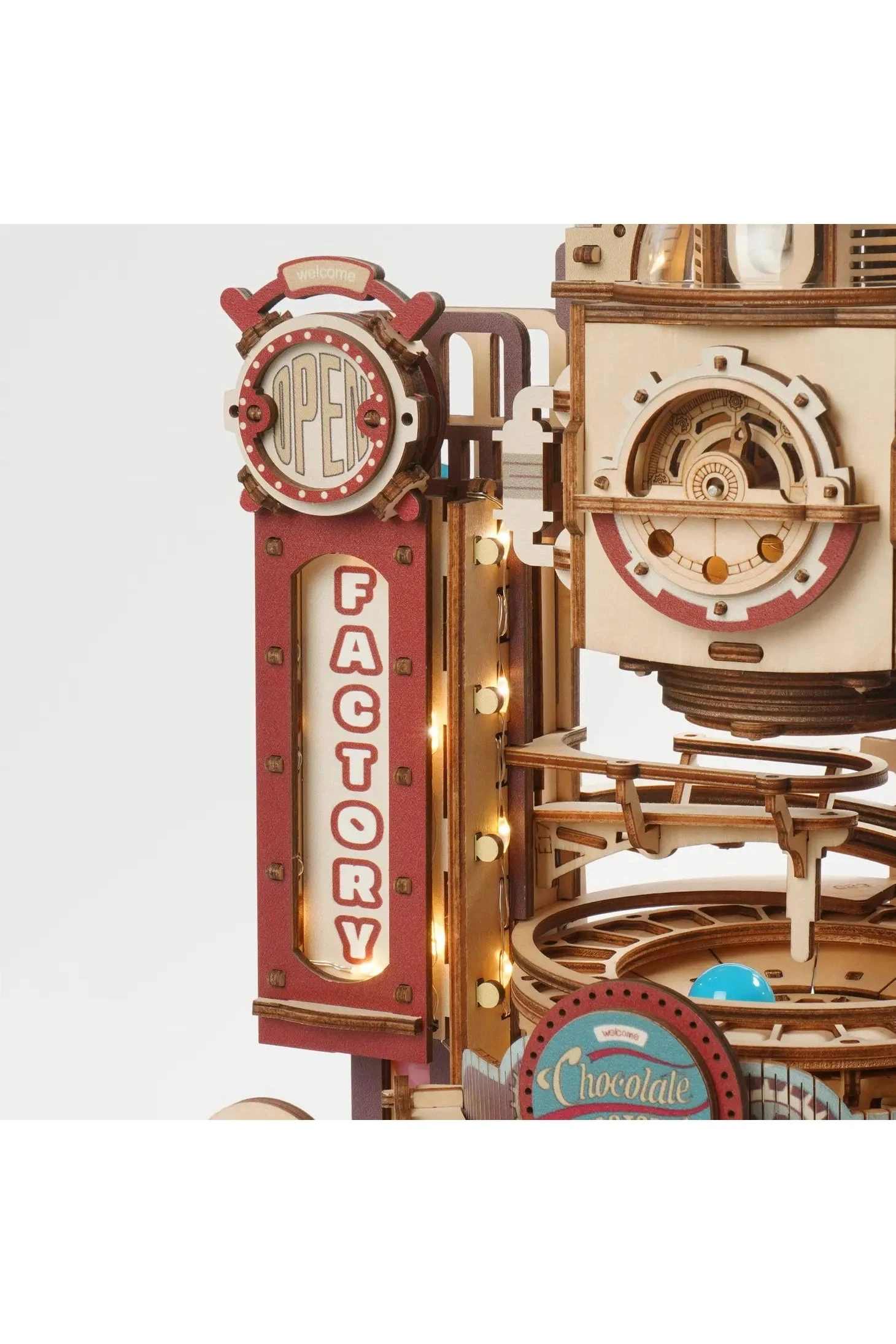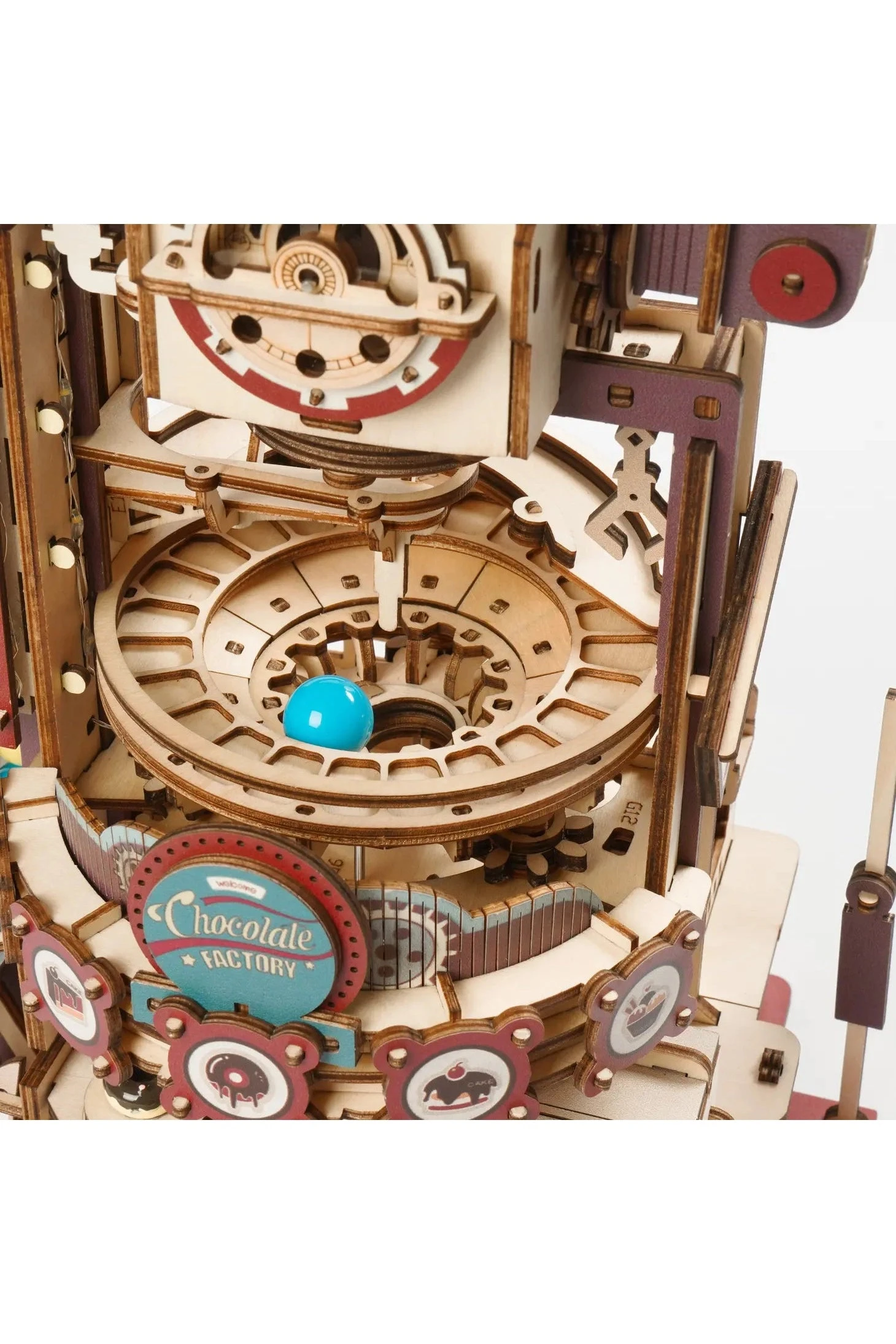 The Chocolate Factory marble run is like none other we’ve had before! It features a colorful design, lights, and glossy marbles in various colors. It’s an intricate 3D wooden puzzle that showcases an effective engineering design combined with lots of fun aspects. Full of twists, turns, and spirals, this marble run is a thrill to watch! It is run completely by mechanical means—no battery needed!
