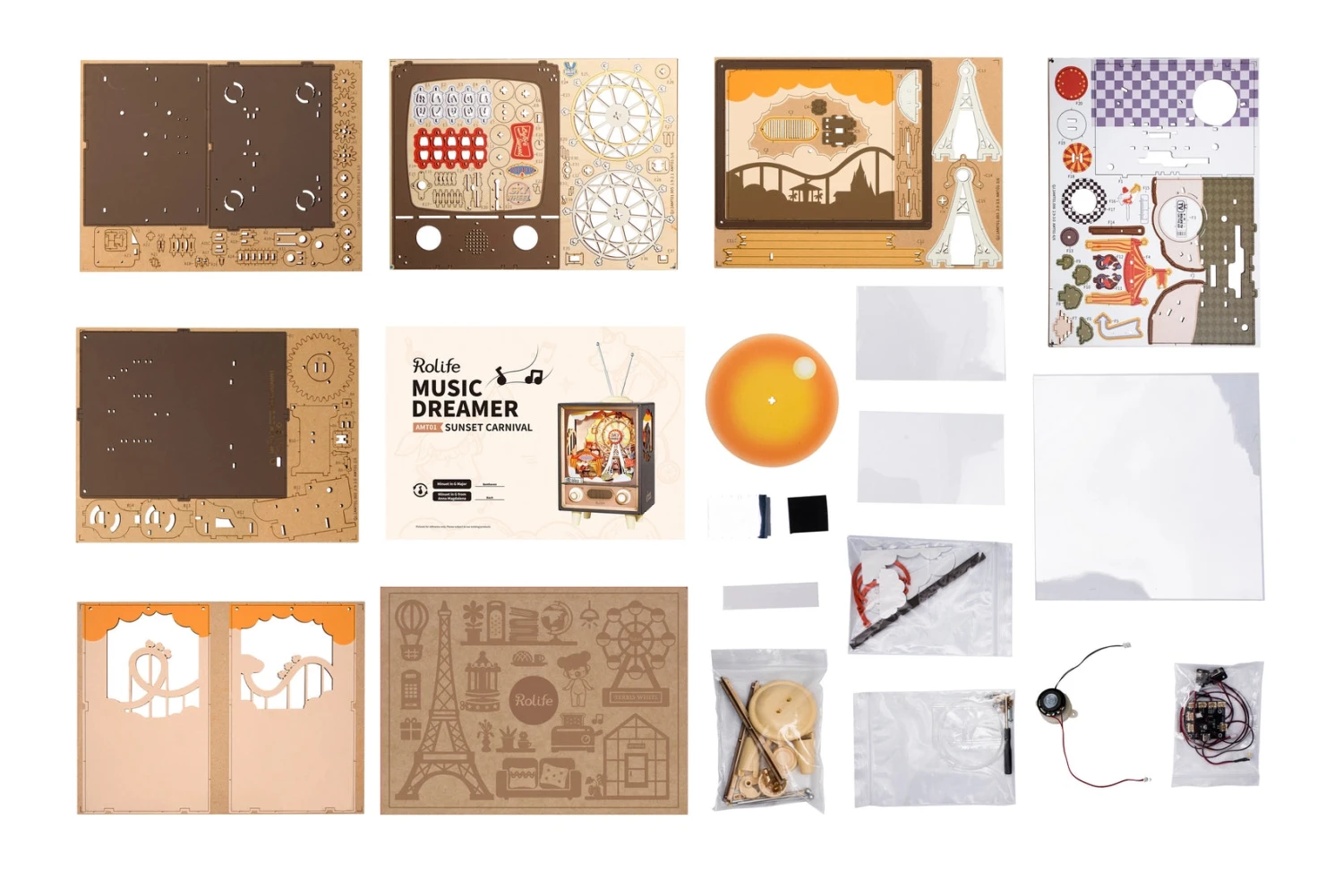 This vintage TV is the framework for a scene of a love story that is embedded into the cutouts of a Ferris wheel, which rotates at a perfect pace. There are circus elements that enhance the enjoyment of the kit. As a person turns one knob, the mechanical gears start the rotation. As the other knob is turned, the lights turn on—creating a beautiful orange sunset as the music start to play and an amusement park dream—bringing you back to cherished childhood memories.