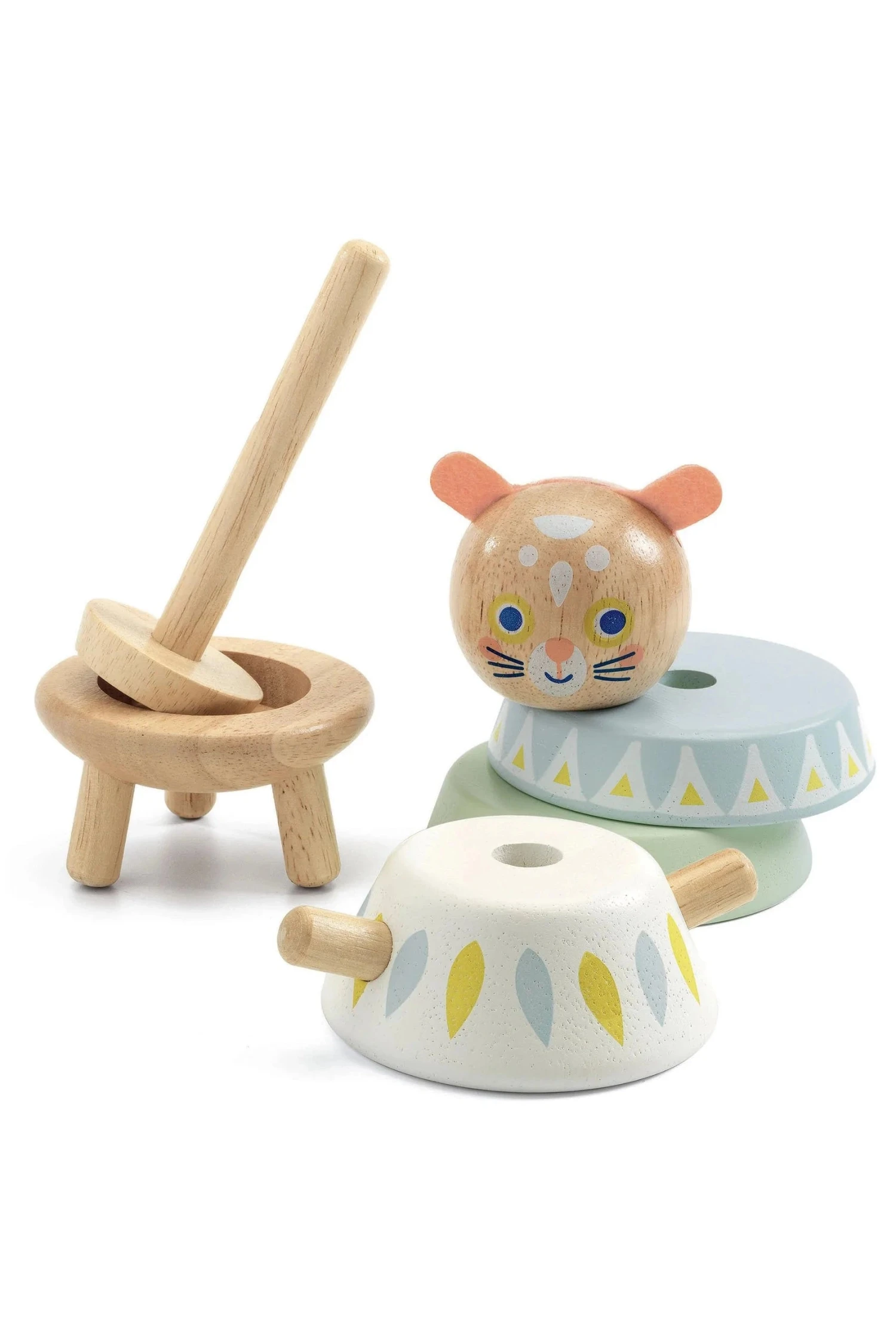 - Contents: 1 stacking developmental toy: 5 wooden pieces and 1 rod.