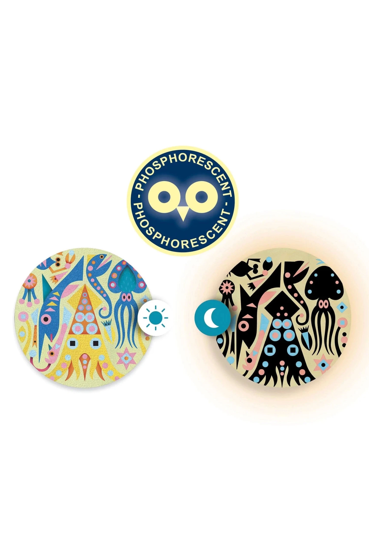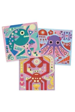 Thanks to the fluorescent sands, the sea creatures glow in the dark! A clever tool designed by Djeco to peel away the protective paper and reveal the pre-glued areas. A clean activity: the child works in the box to avoid scattering the sand. A clever kit where the box has a small hole to collect the excess sand and pour it back into the wide-opening pots.