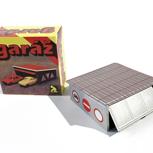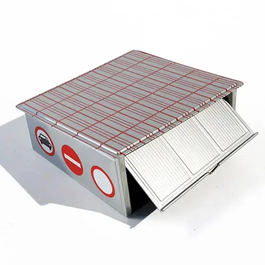 Garage silver printed with road signs This garage is an old original. It was once made for Kovap cars. But cars from other manufacturers also fit into this beautiful garage, which is printed with various road signs.