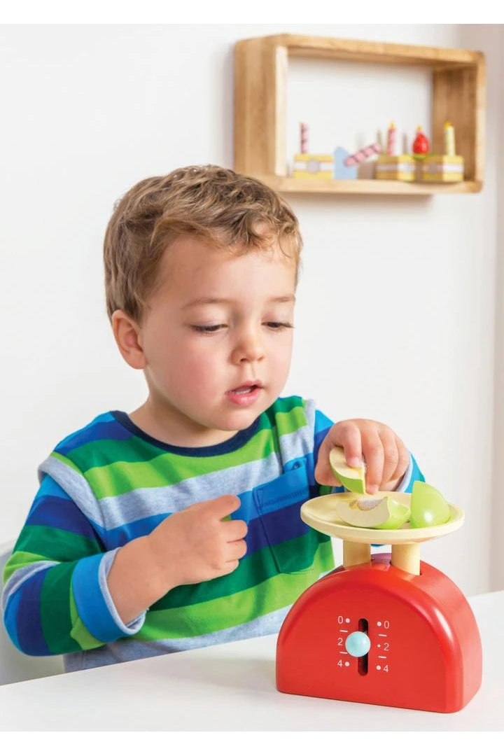 Spark tiny imaginations with these brightly painted wooden weighing scales, decorated using non toxic, water based paint. The clever moving gauge makes for realistic play as they measure out their ingredients for inspired roleplay fun.