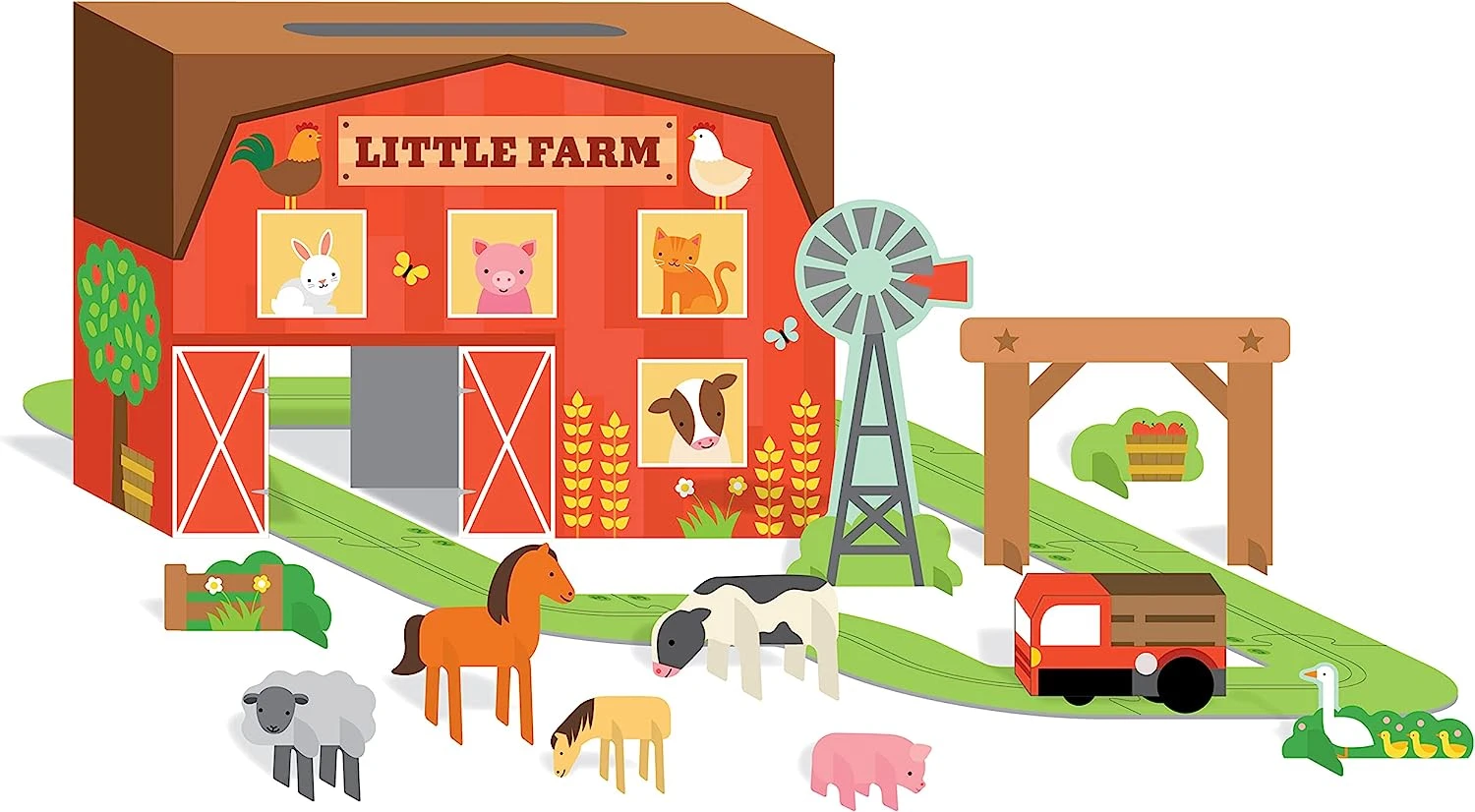 - A double-sided Farm themed play set, a wooden wind-up truck, 8 track pieces and 10 pop-out and play pieces.