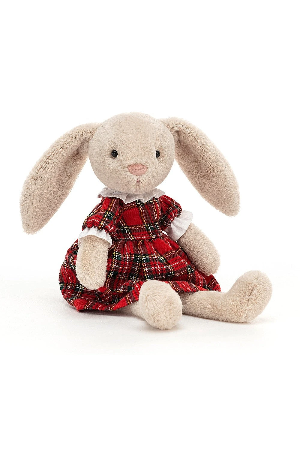 Lottie Bunny Tartan – is a sweet wee lass, dressed up in a fine red and green checked dress! Lopsy Lottie has soft oatmeal fur and ruffled white cuffs and collar, and loves to dance a highland jig!