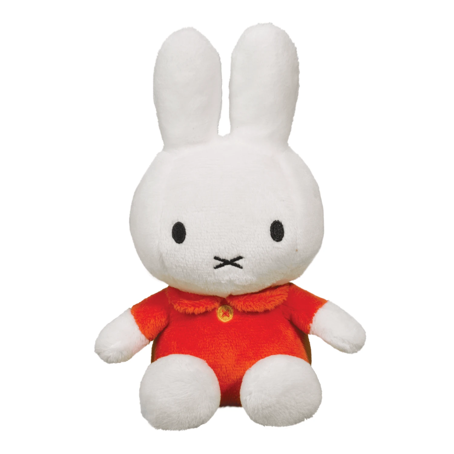 Silky interior polyester fill makes Miffy squeezably soft and lovable. Her endearing crisscross mouth and yellow button on her red dress are created with safe, embroidered details