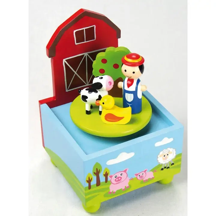 - Wooden music box farm. The farmer stands with his animals on the pedestal in front of the farm with an apple tree the scene turns to the melody “Old McDonald Had a Farm”