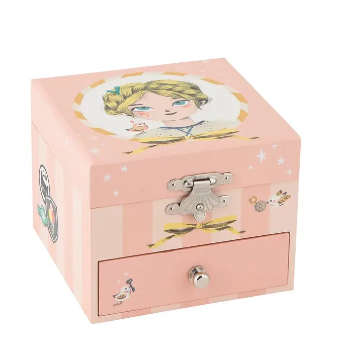 This musical jewelry box beautifully illustrated by Lucille Michielli. Eglantine is spinning round and around to a joyful tune, with her skateboard tucked under her arm. A treasure chest perfect for storing jewelry and little secrets.