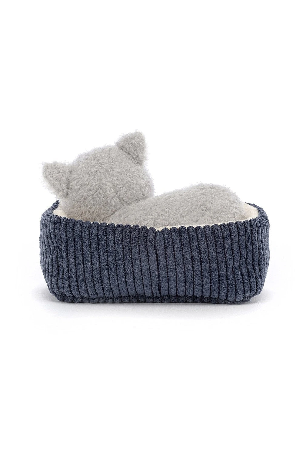 If you lift Napping Nipper Cat up, be very careful not to wake them! This gentle kitten has cloudy-soft fur in soothing pebble grey, with a cream-splash snoot and matching perky ears. All curled up in a cordy blue bed with beautiful buttercream lining, someone’s dreaming of scruffles and salmon.
