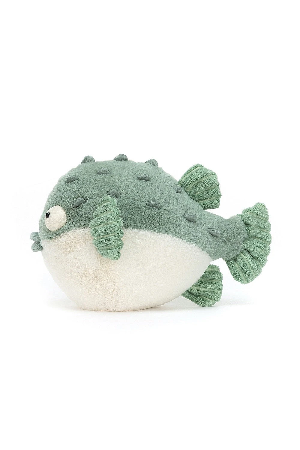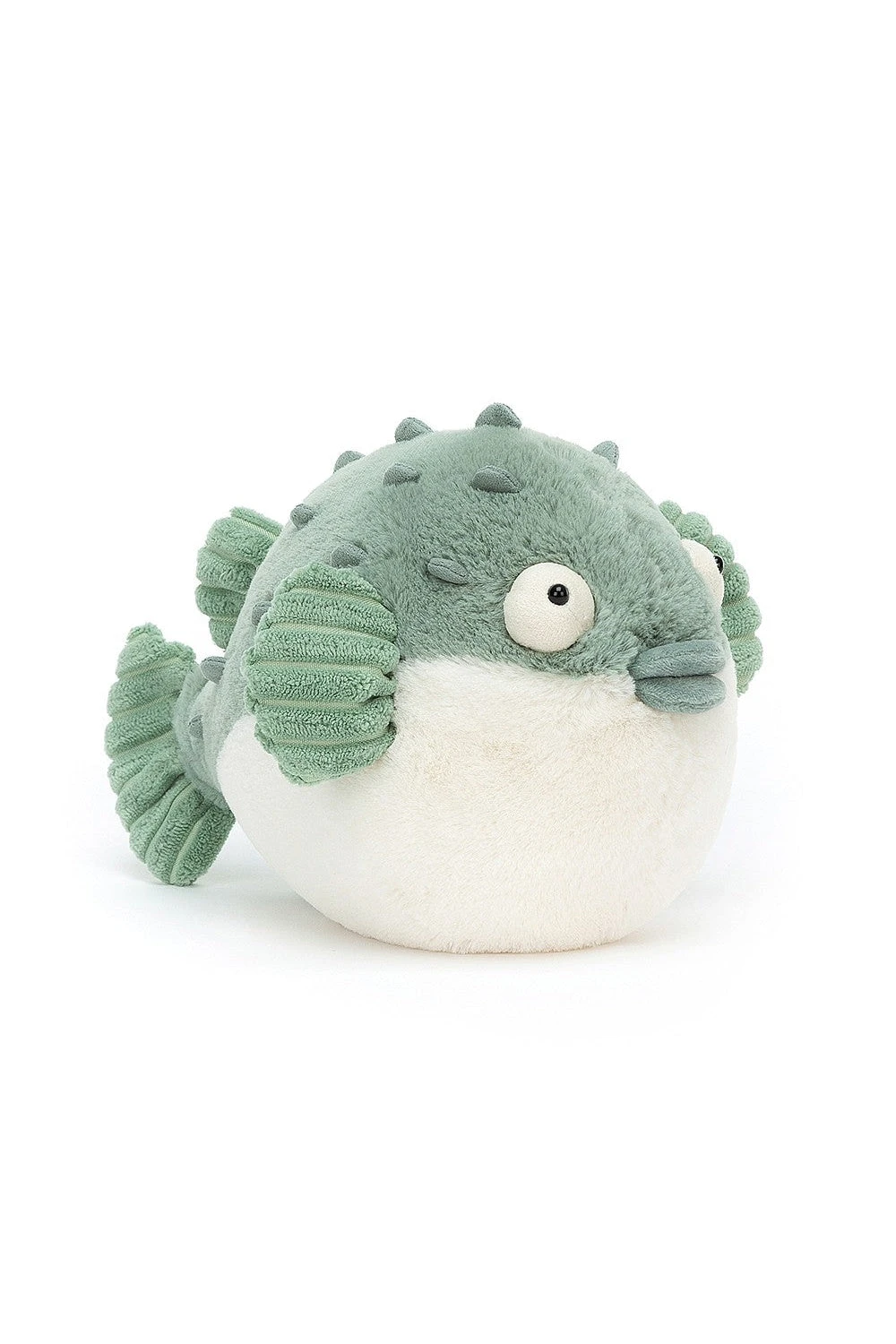 Eep – looks like Pacey Pufferfish has had a big surprise! This dizzy dumpling is perfectly podgy, with a marshmallow tummy and seagrass fur. With stitchy fins, nuzzly knobbles, squidgy lips and boggly eyes, this funny fish is a bubble of cuddles! Chill out Pacey – go with the flow!