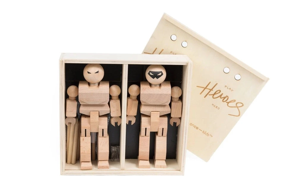 Playhard Hero DIY is a natural and biodegradable wooden action-hero. Made entirely of strong wood with articulated sections connected by elastic string and metal joints, this playtime hero has what it takes to stand up to whatever super villains come their way.