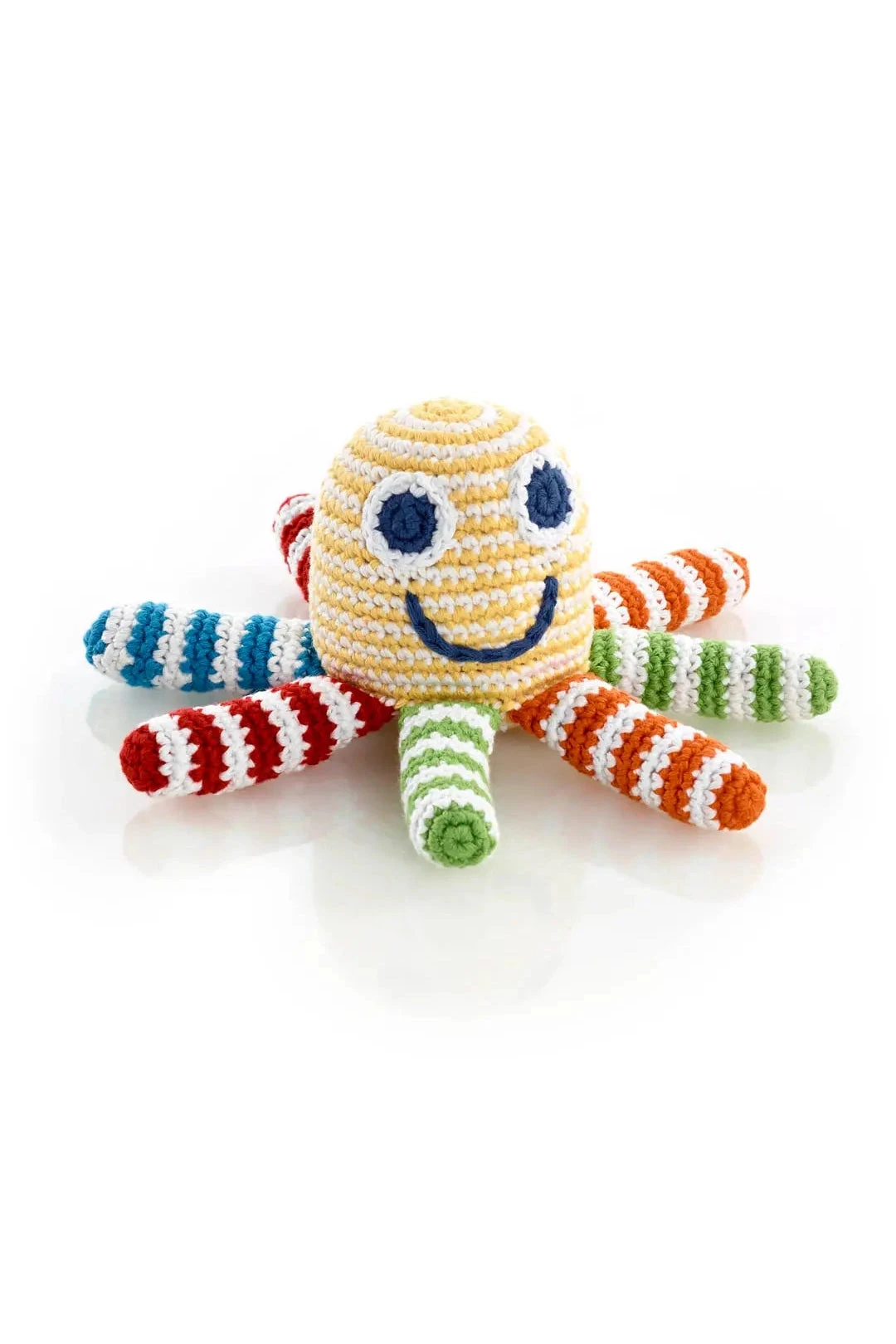 This happy little sea creature is a little hands’ favorite! Our octopus rattle is colorful and full of personality. Handmade with lightweight cotton yarn, its soft rattle when shaken is sure to bring endless laughter and joy to your little one.
