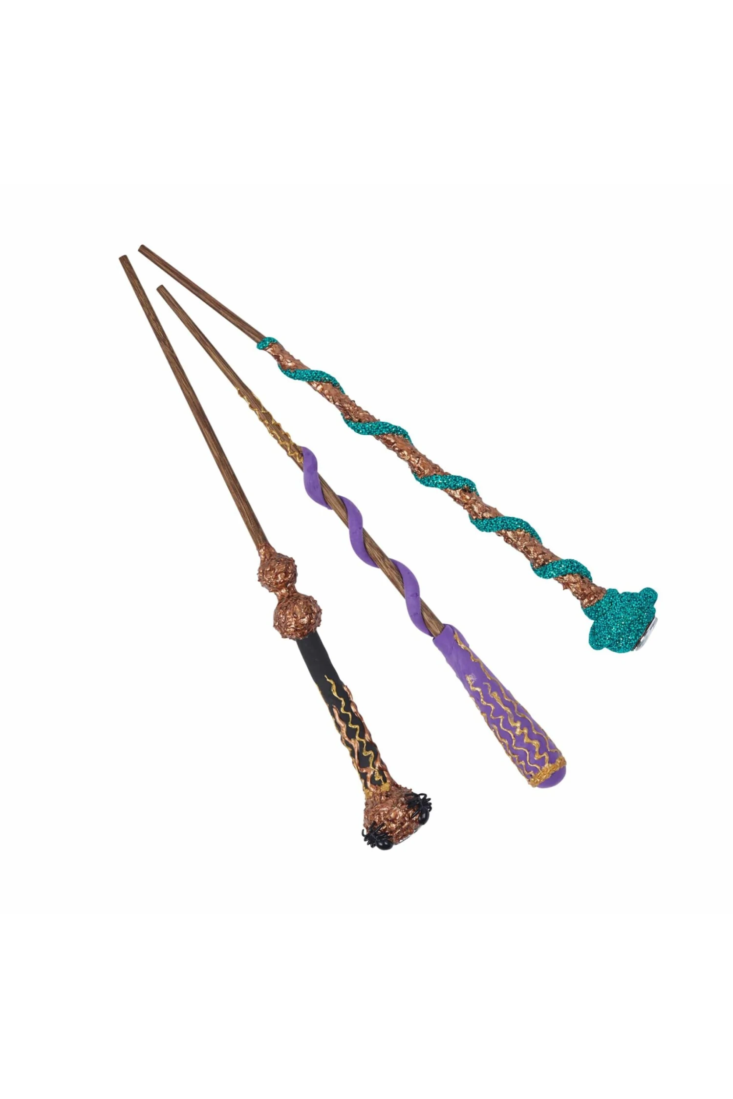- 3 wooden wands, 1 duo pot of Super Clay, 1 oz tube of gold Deco Cream, 16 ml tube of metallic Deco Cream, 1 pot of teal modelling foam, 3 spider decorations, and 2 sparkling jewels