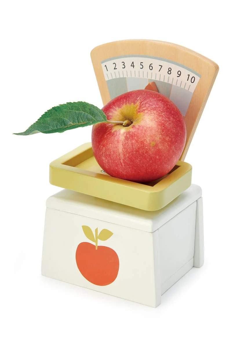 These retro-styled grocery weighing scales are the perfect accessory to pretend play shopping! Place the fruits and vegetables on the tray and see the wooden lever move.