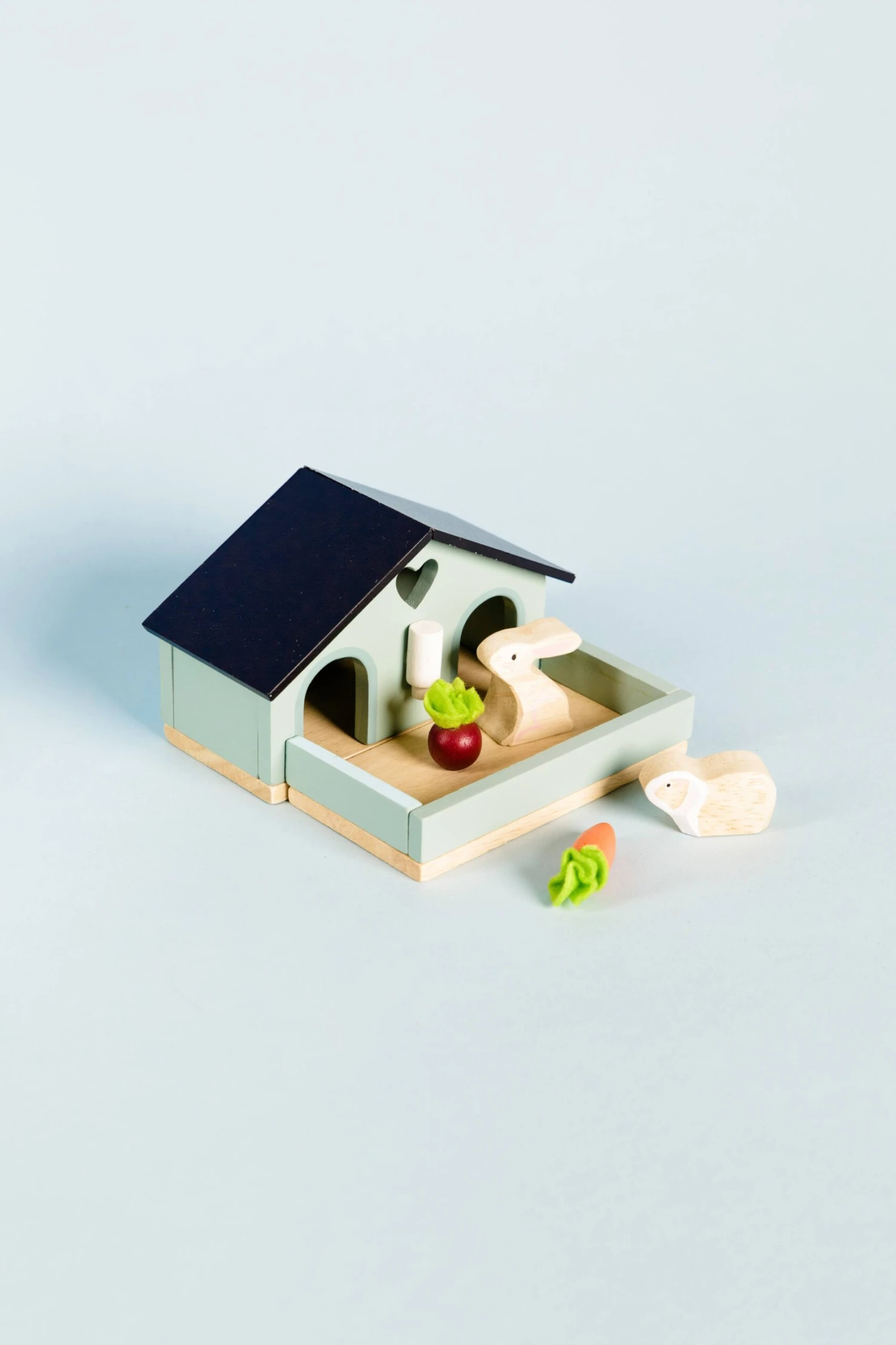 Pet Rabbit Set: This wooden play set encourages imaginative play! It includes a rabbit, guinea pig, and a hutch, as well as a water bottle, carrot, and turnip.