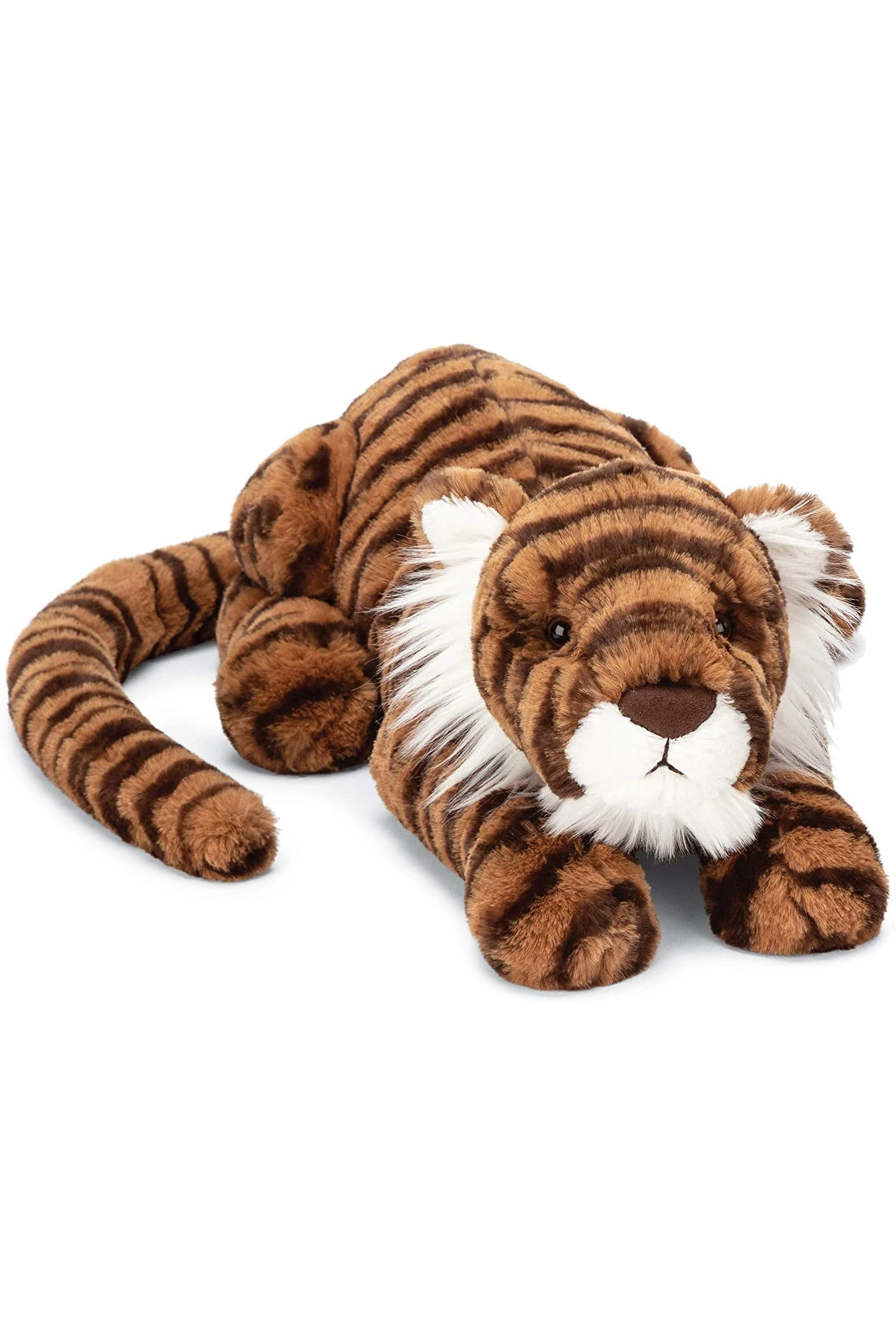 Tia Tiger is so soft with bold tiger stripes and a long swishy tail, this tiger is gorgeously growly. The chunky tiger head has bright, shiny eyes, a squidgy snout and white cheek tufts. Such a loveable tiger.