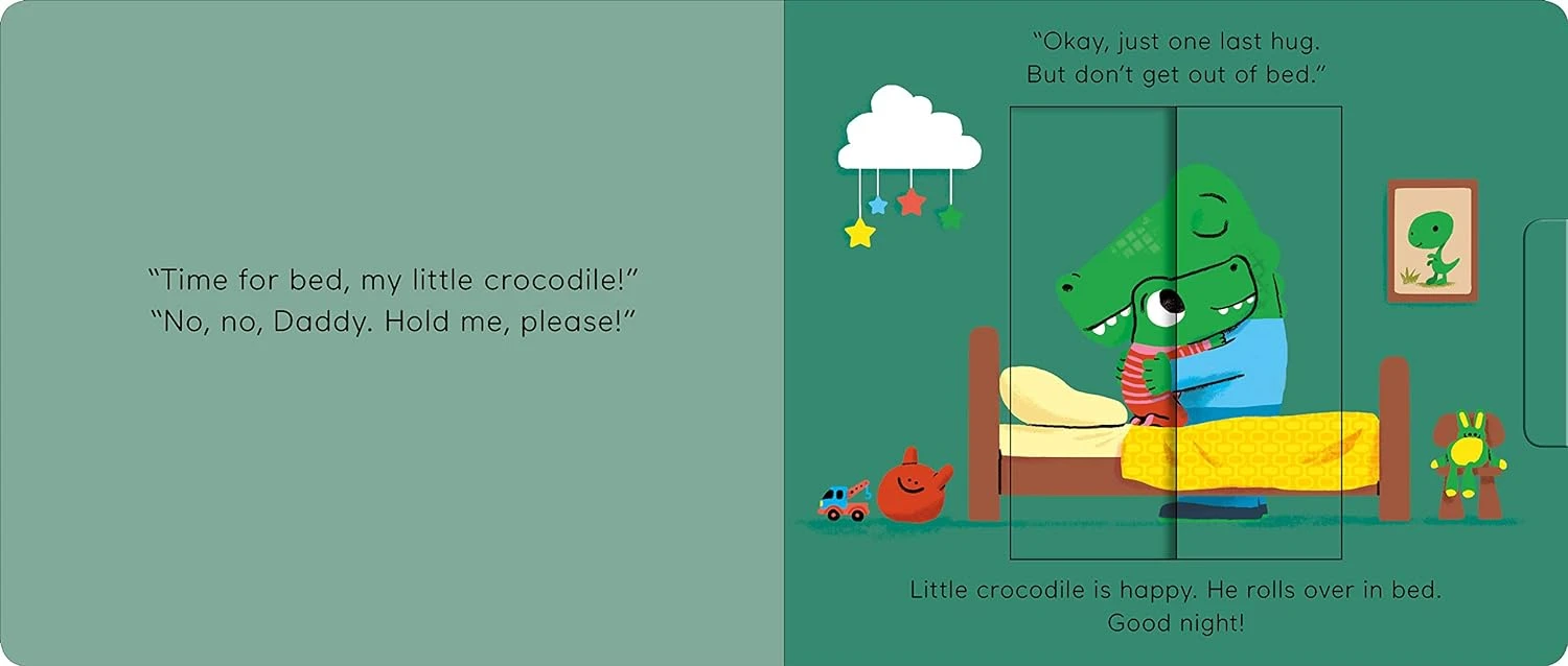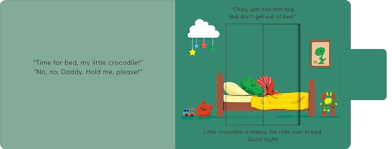 It’s bedtime, but five animal friends just can’t seem to fall asleep. Little Crocodile wants one last hug, Little Monkey feels it’s too dark, and Little Cat just wants to play some more. With patience and understanding, their moms and dads know just how to soothe their children, and provide the comfort that eventually sends them off to sleep. Young children will enjoy pulling the tabs to change the pictures on every spread, to see just how the little animals are reassured. A timely and important addition to preschool books about growing up.