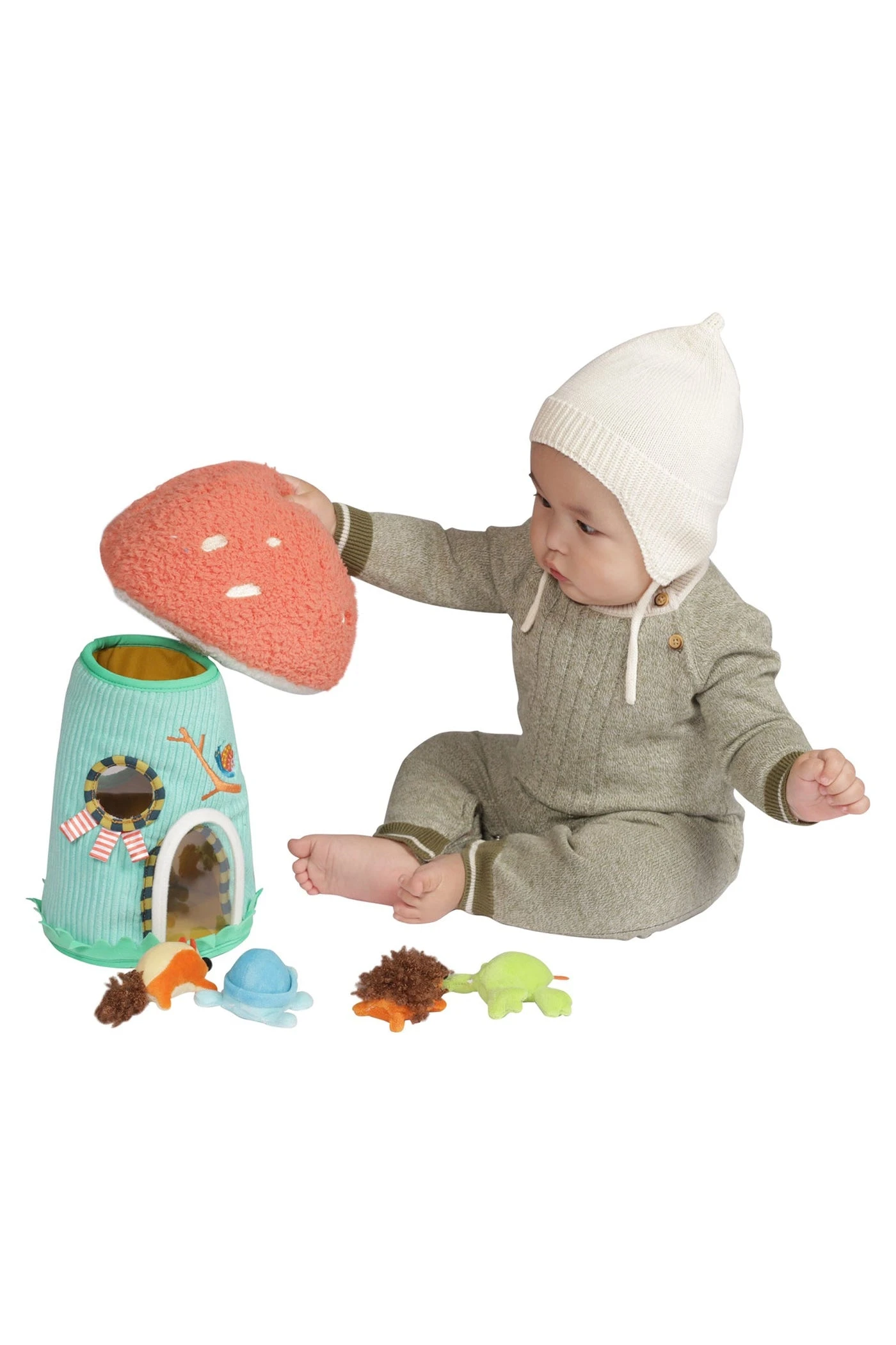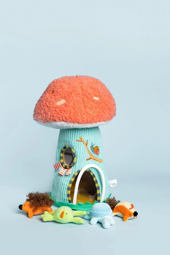 This whimsical mushroom is covered in a variety of fabric textures and offers fill and spill play for busy little ones. It comes with four woodland themed characters featuring playful fabrics, weighted bodies and happy expressions – squirrel, turtle, hedgehog and frog. There are three different ways to fill and spill toys from the mushroom housing – front door, back window and out the top. The coral-colored mushroom top is removable. The delightful mushroom features whimsical illustrations and touch and feel textures. Encourages fill and spill play, motor development and cognitive learning.