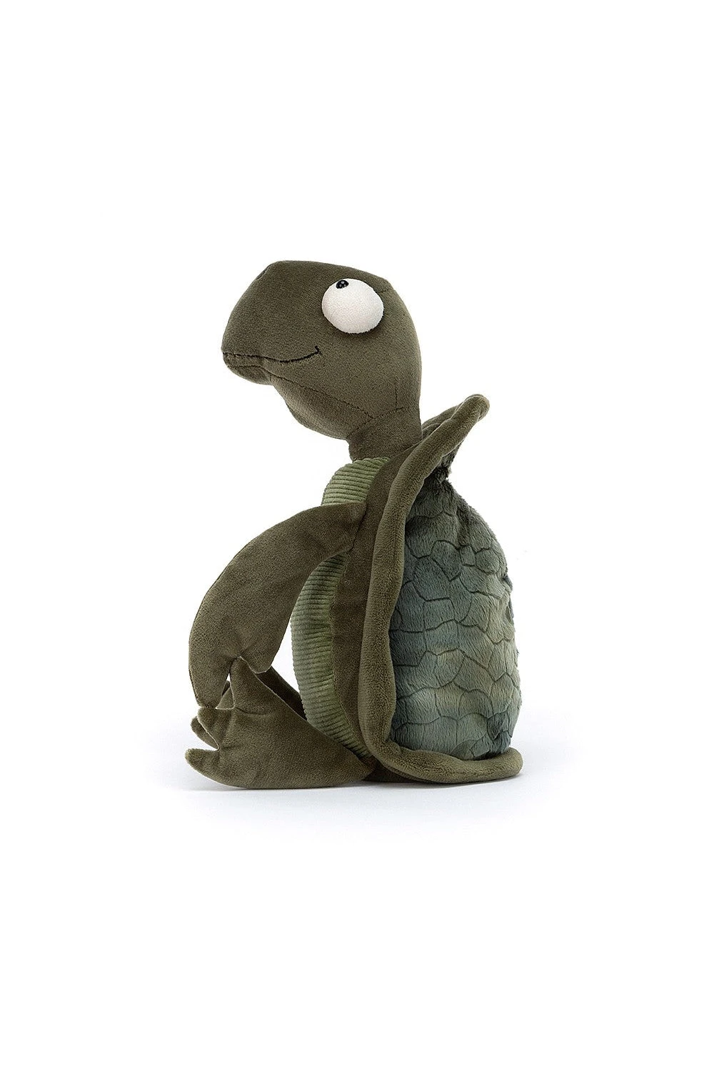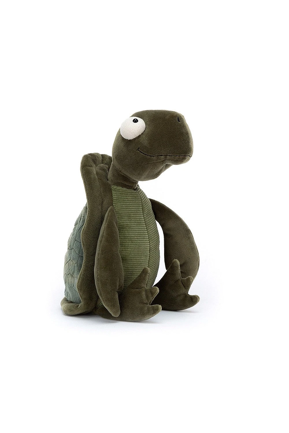 Tommy Turtle is a kooky companion with splendid seaweed-green fur. This tumbly turtle has a soft, textured shell with a mottled pattern and velvety frill, a chunky-soft beak, cordy tum and great big curious eyes! Flap those flippers and head to the beach!